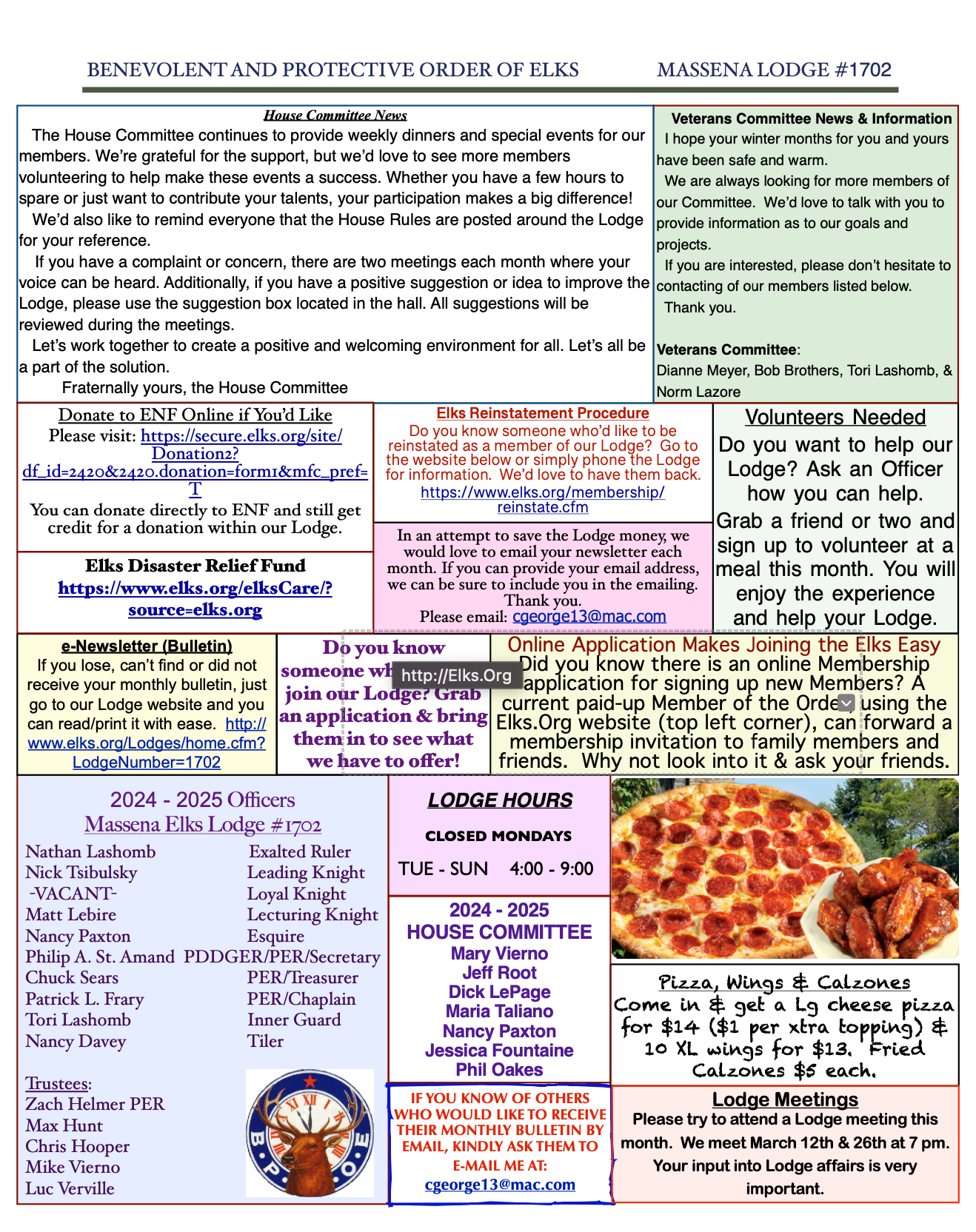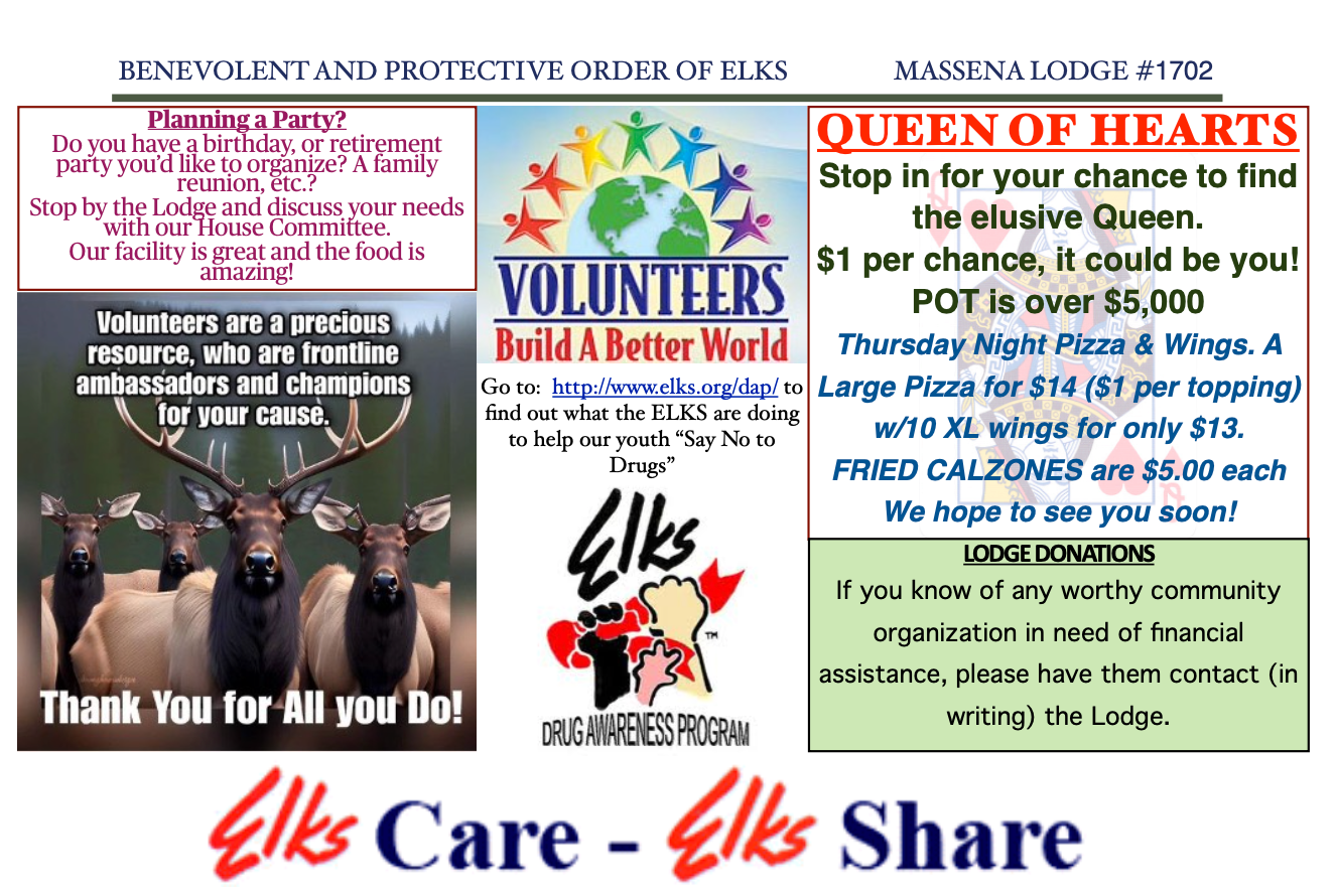 We proudly showcase the activities and initiatives of our local Elks Lodge. The Massena Elks are dedicated to serving our community through various charitable programs, youth activities, and veteran support. As part of the Benevolent and Protective Order of Elks (BPOE), our mission is to inculcate the principles of Charity, Justice, Brotherly Love, and Fidelity. We strive to make a positive impact on the lives of our members and the community at large.